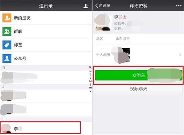 一、首先打开新版微信,然后进入微信【通讯录】,之后找到需要发红包的好友点击打开,在弹出的详细资料界面中,点击【发消息】。