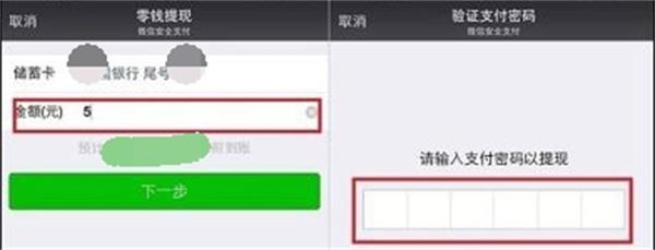 三、在零钱提现中,选择好存储卡(也就是选择需要提现到的银行卡,然后输入要提现的金额,完成后点击【下一步】,最后再输入一次支付密码以提现。