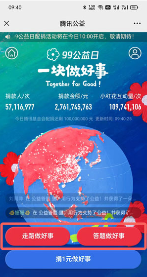 3、进入腾讯公益后,可通过走路、答题的方式来获得小红花;