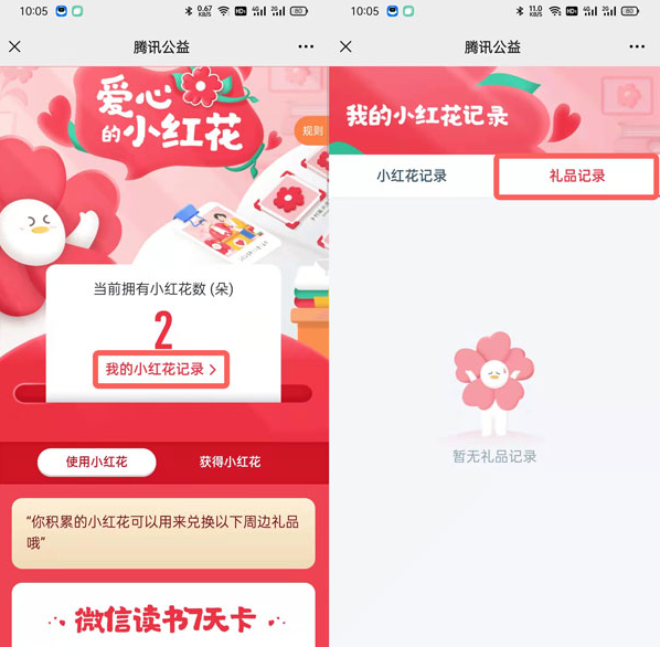 在腾讯公益中获得的小红花,可直接用来兑换微信读书7天卡、小红花胸针、小红花抱枕、小红花冰箱贴、环保单肩包、小红花t恤、公益五彩原蜜。