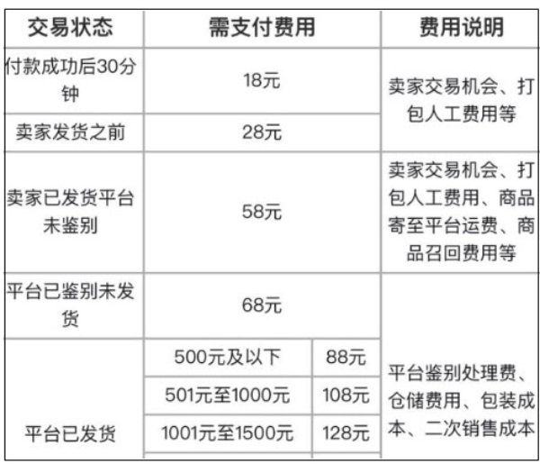 在得物购物的时候30分钟内退款是扣18元的,如果超过30分钟退款的话,会扣28元的,如果卖家发货了退款的话是需要扣58元,另外不同的鞋子退款的话手续费也是不同的,大家可以看一下。