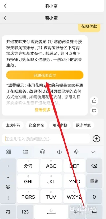 3、发送“花呗付款”,点击回复中的“开通花呗支付”即可。