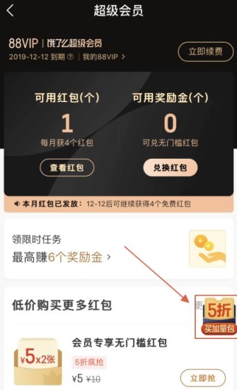 3.进入【超级会员】的界面,点击【5折买加量包】。在这个界面中,除了之前超级会员每月有4...