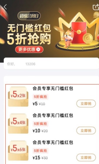 2.接着点击中间的【超级会员】。这里能看到之前就有的会员专享无门槛红包。