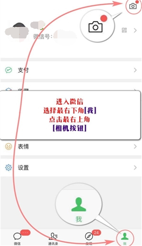 1、其实为时刻视频设置音乐的方法非常简单,大家需要先从微信的个人中心点击右上角拍摄按钮(如下所示),进入视频录制页面。